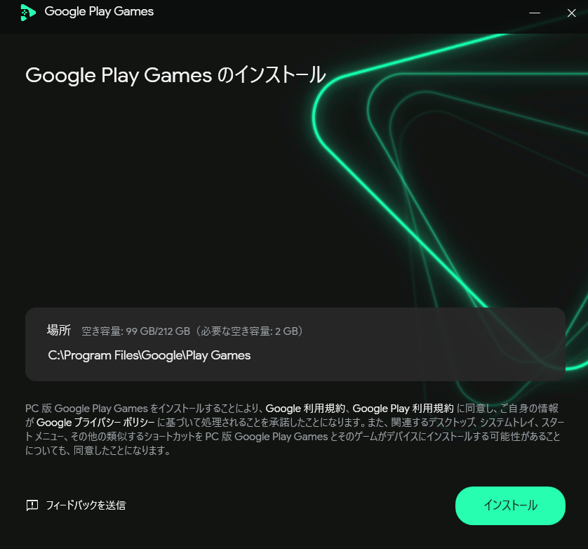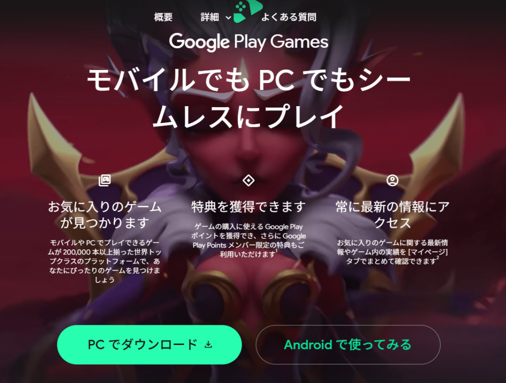 Google Play Gamesの公式サイトへアクセスし、PC版をダウンロードします。